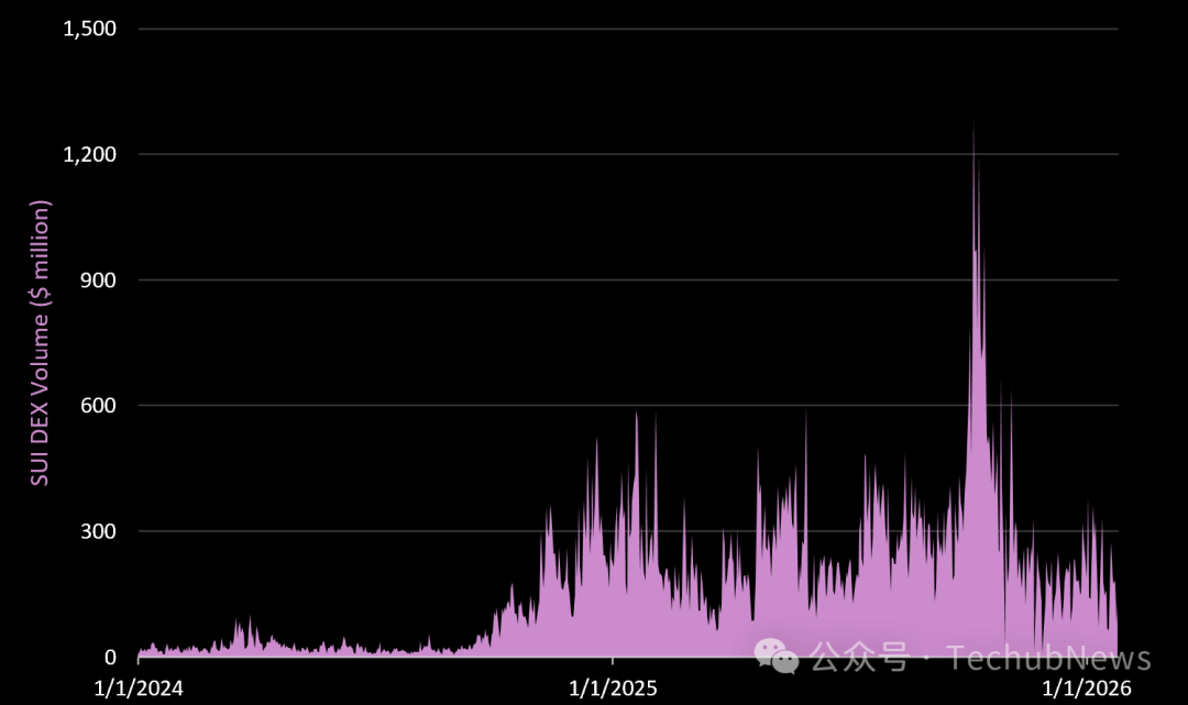 Sui 的总锁仓价值(TVL)目前略低于 10 亿美元,较 2025 年 10 月 9 日峰值的 26 亿美元下降了 61%。我们认为,大部分下降可归因于 SUI 代币价格的下跌,同期该代币价格已下跌 73%。
