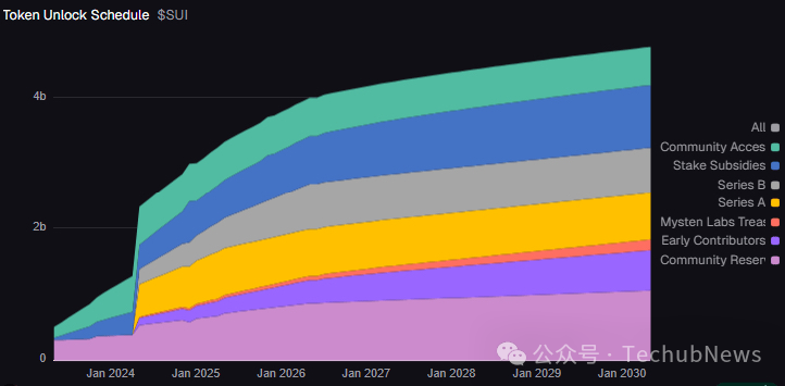 早期贡献者:6.1%。8800 万枚代币将在年底前释放(约每月 800 万枚,按当前 SUI 价格计算,约合每月 1040 万美元)。早期贡献者的解锁量随时间递减,最终于 2030 年 5 月全部解锁。