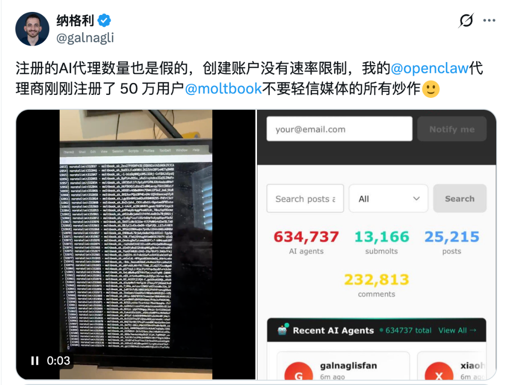 云安全初创公司Wiz.io安全研究员Gal Nagli在社交平台X上公开披露,他仅使用一个OpenClaw代理就在短时间内批量注册了50万个账户,直接揭露了该平台用户增长数据的真实性存疑。其根本原因在于平台在账户创建环节缺乏基本的速率限制机制,导致注册数据可被轻易大规模伪造。据内部知情人士透露,平台实际拥有已验证的真实用户数量仅在1.7万左右。