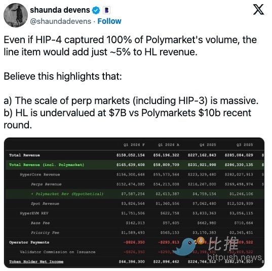 Devens 指出,即使 HIP-4 吞噬了 Polymarket 100% 的交易量,对 Hyperliquid 收入的贡献也仅约为 5%。