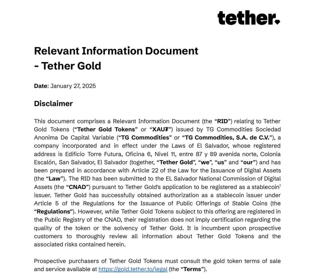 根据 2025 年 1 月 27 日发布的最新版白皮书《Relevant Information Document – Tether Gold(XAU₮)》,Tether Gold(XAUt)是由萨尔瓦多公司 TG Commodities, S.A. de C.V. 发行的黄金稳定币。