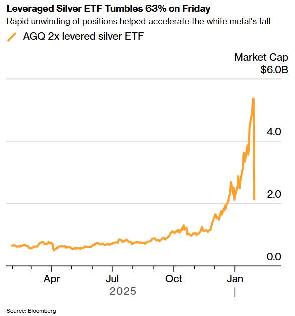 许多投资者还大量涌入杠杆押注,这进一步加剧了抛售的连锁反应。这些押注包括对持有期货合约的投机者的追加保证金要求,以及杠杆交易所交易产品,如代码为AGQ的ProShares Ultra Silver。该产品在整个一月份放大了白银的涨势。上周五,AGQ为反映其持有的白银资产降低后的价值,不得不迅速平掉价值数十亿美元的白银头寸,从而加速了这场暴跌。