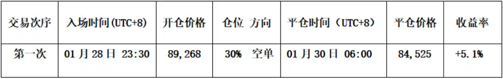 • 第一次交易(盈利 5.1%):本次操作执行方案 A(有效跌破上升通道下轨做空)策略:当币价反抽至上升通道下轨呈现上攻乏力,价差模型首先发出顶部预警信号(绿点),然后其与动能模型共振触发顶部信号,我们于89,268 美元建立30%空头仓位,随后市场走势出现调整。当币价跌至84,000 美元支撑位时,价差模型率先发出触底预警信号(红点),随后动能量化模型与价差交易模型再次共振生成底部信号,据此我们于84,525 美元全部平仓,实现成功盈利。