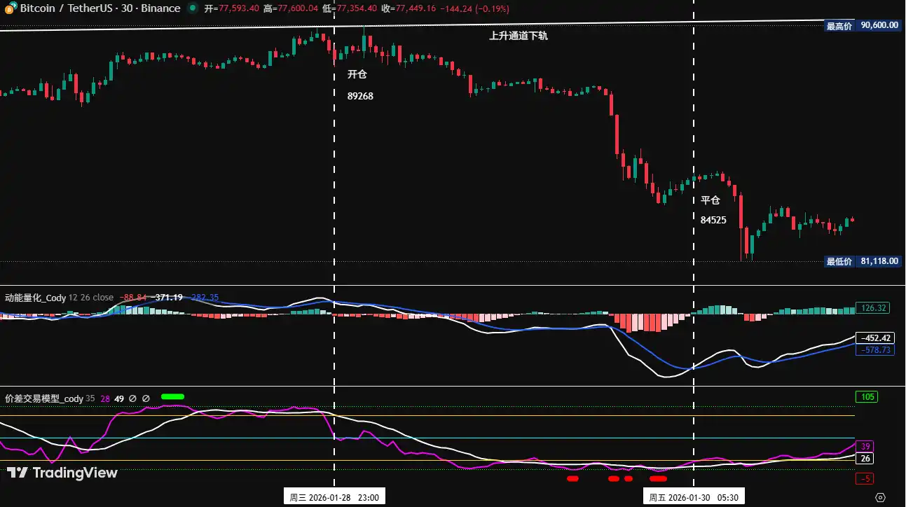 比特币 30 分钟 K 线图:(动能量化模型+价差交易模型)