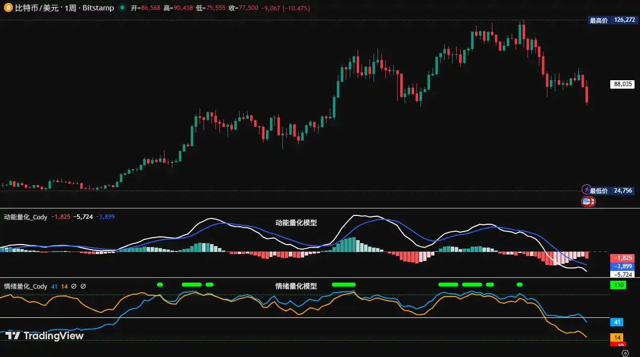 比特币周 K 线图:(动能量化模型+情绪量化模型)