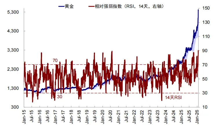 图表3:黄金的14天RSI达90,持续位于超买区间
