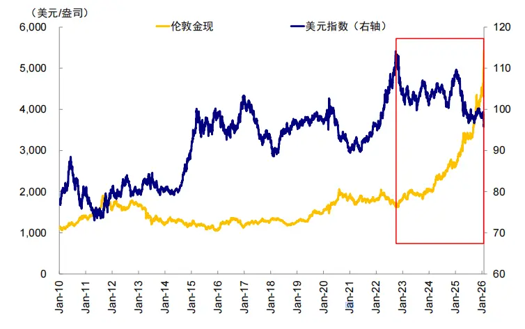 ► 是因为实际利率走低吗?不是。实际利率是黄金传统定价框架的关键,可看作持有黄金的机会成本,也是黄金抗通胀属性的体现。然而,实际利率从2022年9月的1%最高升至2023年10月的2.5%,黄金却逆势上行。远的不说,2025年11月以来金价上行斜率再度变陡,但在美国降息预期摇摆的情况下,实际利率整体从1.7%走高至1.97%,也无法解释这波金价上涨。