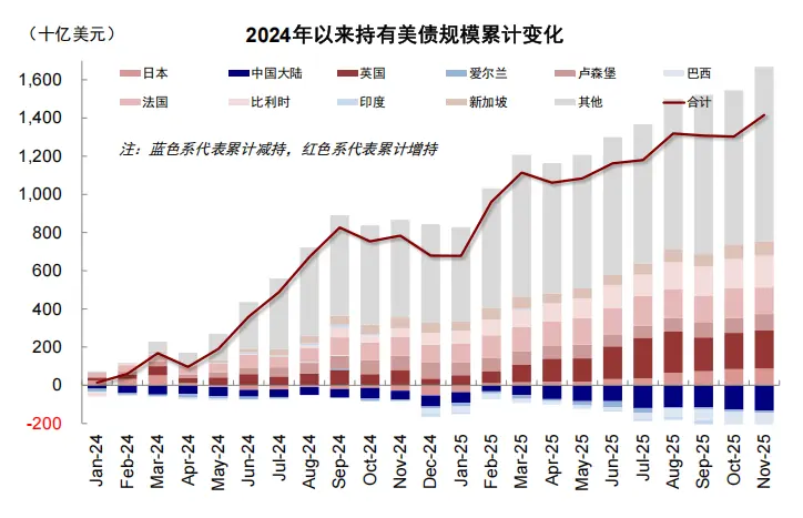 之所以这么说,是因为我们注意到,一部分货币当局在抛售美债买入黄金(以亚洲及新兴国家为主,如2022年以来中国大陆、土耳其和印度央行分别增持357吨、253吨和133吨),而一部分货币当局仍在继续买入美债买到新高(如2025年以来英国、日本、比利时分别增持1657亿美元、1411亿美元、1064亿美元美债),形成“泾渭分明”的两个阵营。
