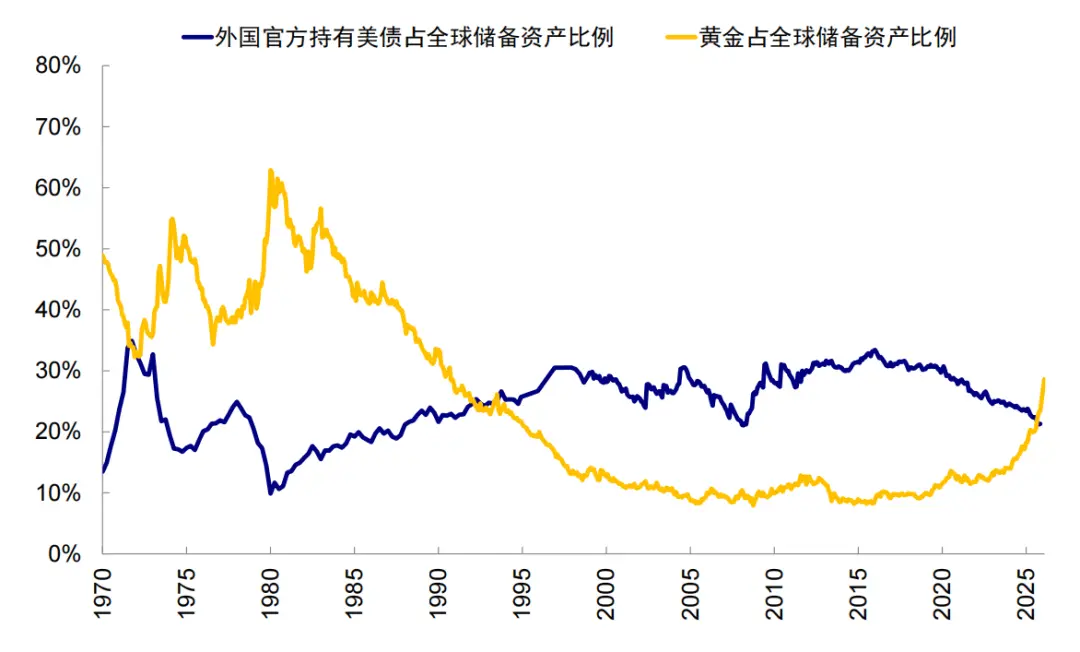 1) 储备份额:截至2025年三季度,美元在储备货币中占比仍有57%,远高于其它货币。但若按占全球储备资产中比例计算,外国官方持有的美债(21.3%)已经低于黄金(28.6%,按最新金价计算)。