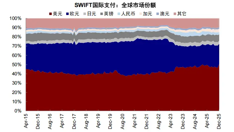 2) 国际支付份额:截至2025年12月,美元在全球支付中份额占50.5%,远超第二名的欧元(21.9%)。全球银行系统(SWIFT)和衍生品交易大多锚定美债,已形成一定网络效应,切换系统的成本极其高昂。