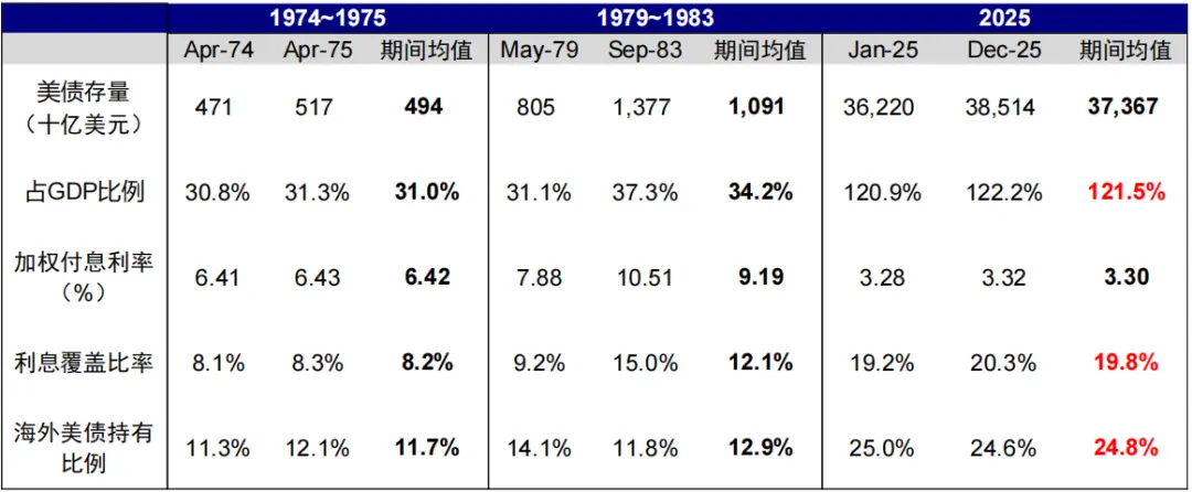 随后不久沃尔克采取强硬手段对抗通胀。1979年8月,沃尔克接任美联储主席。幸运的是,虽然彼时美国饱受高通胀侵扰,但财政压力不大,甚至高通胀稀释了部分压力。美债规模占GDP比例1978-1979年逐步下滑,在沃尔克上任时仅30-31%(vs. 2025年均值121.5%);政府利息覆盖率虽然在1979年上升至9.2%,但和1970年的7.5%相比增幅可控,也明显低于2025年接近20%的均值。这为货币政策紧缩提供了较大空间。1979年10月,沃尔克宣布将政策目标直接转为“货币供应量”,意味着联邦基金利率的上行将不受约束。