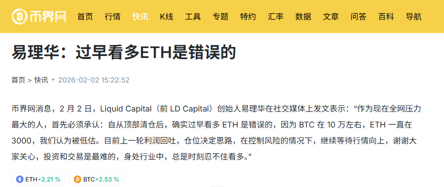 2026年2月,随着比特币价格跌到78000美元左右,以太坊在约2300美元附近挣扎,市场情绪一度低迷。这时,一位行业老将的发文引起了广泛关注:“作为现在全网压力最大的人,首先必须承认:自从顶部清仓后,确实过早看多 ETH 是错误的,因为 BTC 在 10 万左右,ETH 一直在 3000,我们认为被低估。目前上一轮利润回吐,仓位决定思路,在控制风险的情况下,继续等待行情向上,谢谢大家关心,投资和交易是最难的,身处行业中,总是时刻忍不住看多。”