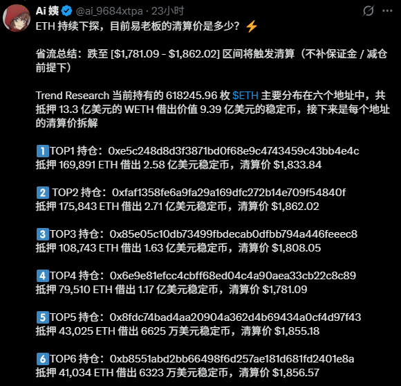 这位发文者正是易理华。据2月2日链上分析师Ai姨发的推文,当时易理华的ETH已浮亏超5亿,清算价为1800美元附近。这意味着价格若再跌 20%,这位行业大佬将面临爆仓风险。