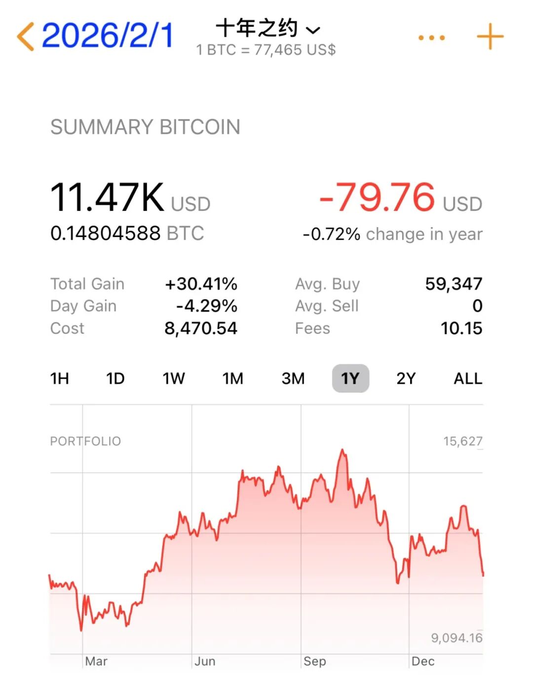 1月份结束了,逢跌加仓。晚上一看,惊喜地发现BTC竟然已经跌到7字头了。忍了整整一个2025牛市暂停不追高,忍到现在跌回7字头,终于可以恢复正常的八字诀操作策略了。本次加仓是十年之约执行第32个月,第61篇笔记,第44次加仓。加仓价格77,577,把此前没有打出去的子弹也一起用了。加仓后持仓成本终于来到了6字头(6万刀),仓位收益率降至27%。大饼价格从9字头降到8字头再降到7字头,十年之约仓位均价从2字头升至3字头、4字头、5字头再到如今6字头,可谓是与BTC双向奔赴了。
