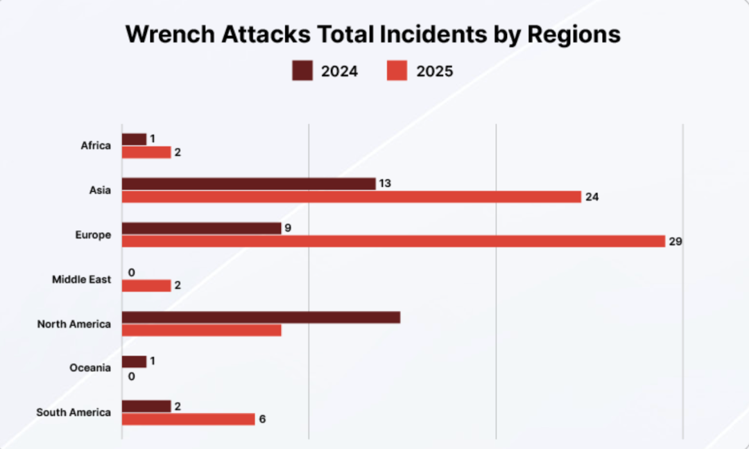 从财务影响看,2025年已确认的扳手攻击相关损失超过4,090万美元,同比增长44%。然而报告警告称,由于受害者报案意愿低、担心报复、部分资产涉及逃税或灰色地带等因素,这一数字仅是“冰山一角”。