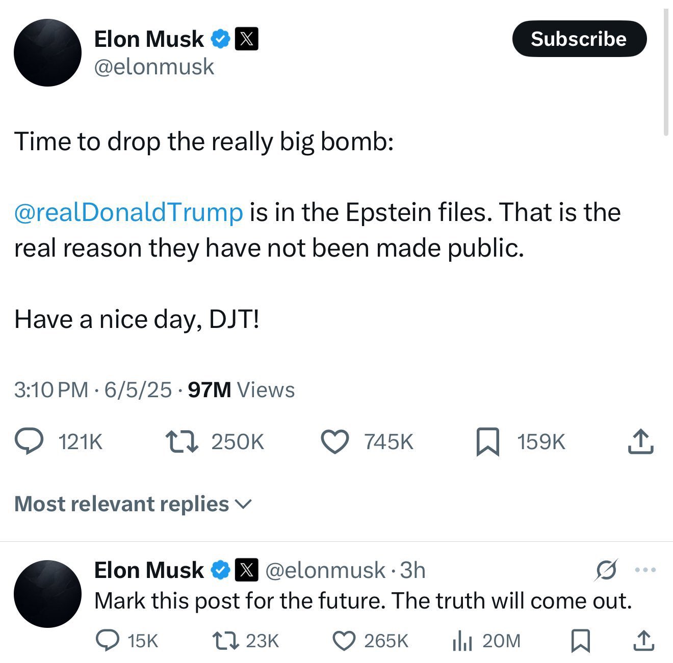 在协助Trump政府削减政府开支后,Tesla CEO Elon马斯克曾公开呼吁政府公布爱泼斯坦文件。在一条现已删除的X帖子中,马斯克写道:
