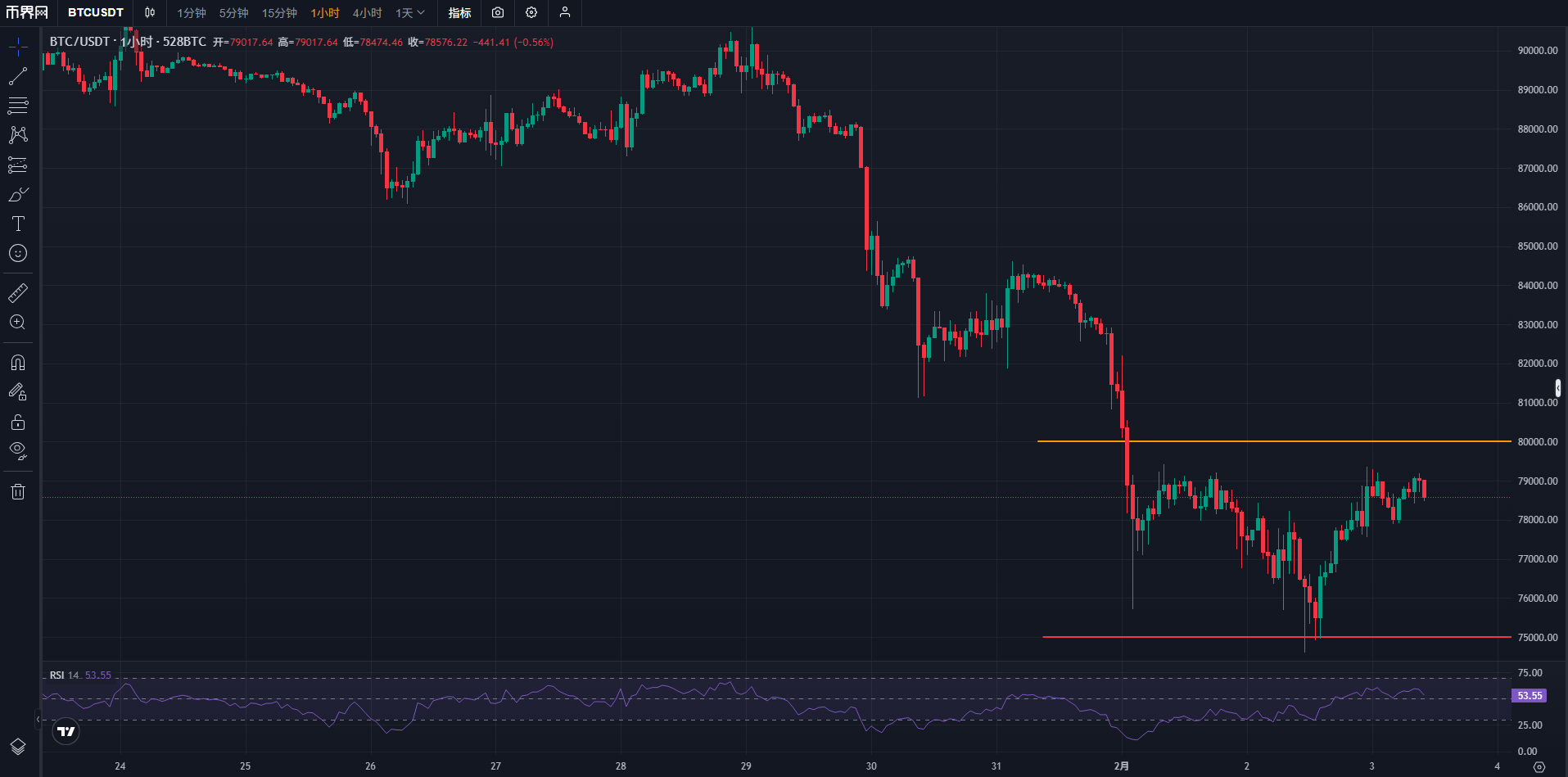 从当前比特币的价格走势图来看,当比特币价格下跌并触及至去年最低价格附近时,出现了较为明显的止跌迹象。可以看到,其价格在触及75,000美元的区间低点后迅速回升,在撰写本文时,比特币价格已回升至78,500美元附近。