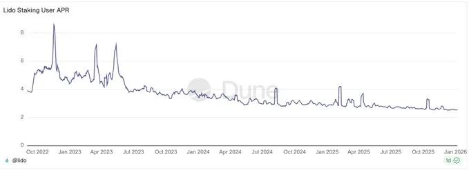 如果你查看过去一年的质押收益率,方向就很明确了。峰值仍然会发生,但基线已经发生了变化。在当前的机制下,质押收益率更接近 2.5%。