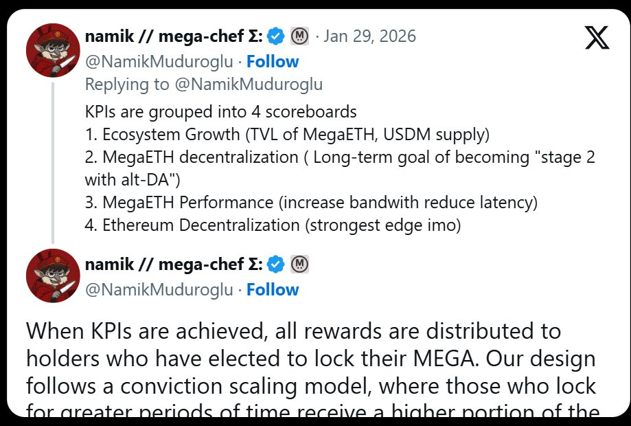 这个 KPI 计划的另一个有趣因素是:当达成 KPI 时,谁会获得 MEGA。根据 Namik 的推文,获得 MEGA 解锁的人是那些将 MEGA 质押到锁定合约中的人。