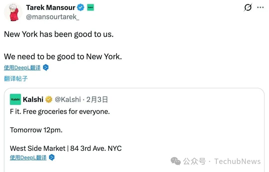 Kalshi 这场免费快闪活动的高明之处在于它同时实现了三重目标:为急需者提供即时救济,为品牌制造病毒式传播内容,更为预测市场这一饱受争议的金融创新,披上了一件温暖的「社区关怀」外衣。正如 Kalshi 首席执行官 Tarek Mansour 在社媒上的表态——「纽约待我们很好。我们也应该善待纽约」——构成了典型的科技精英慈善叙事。