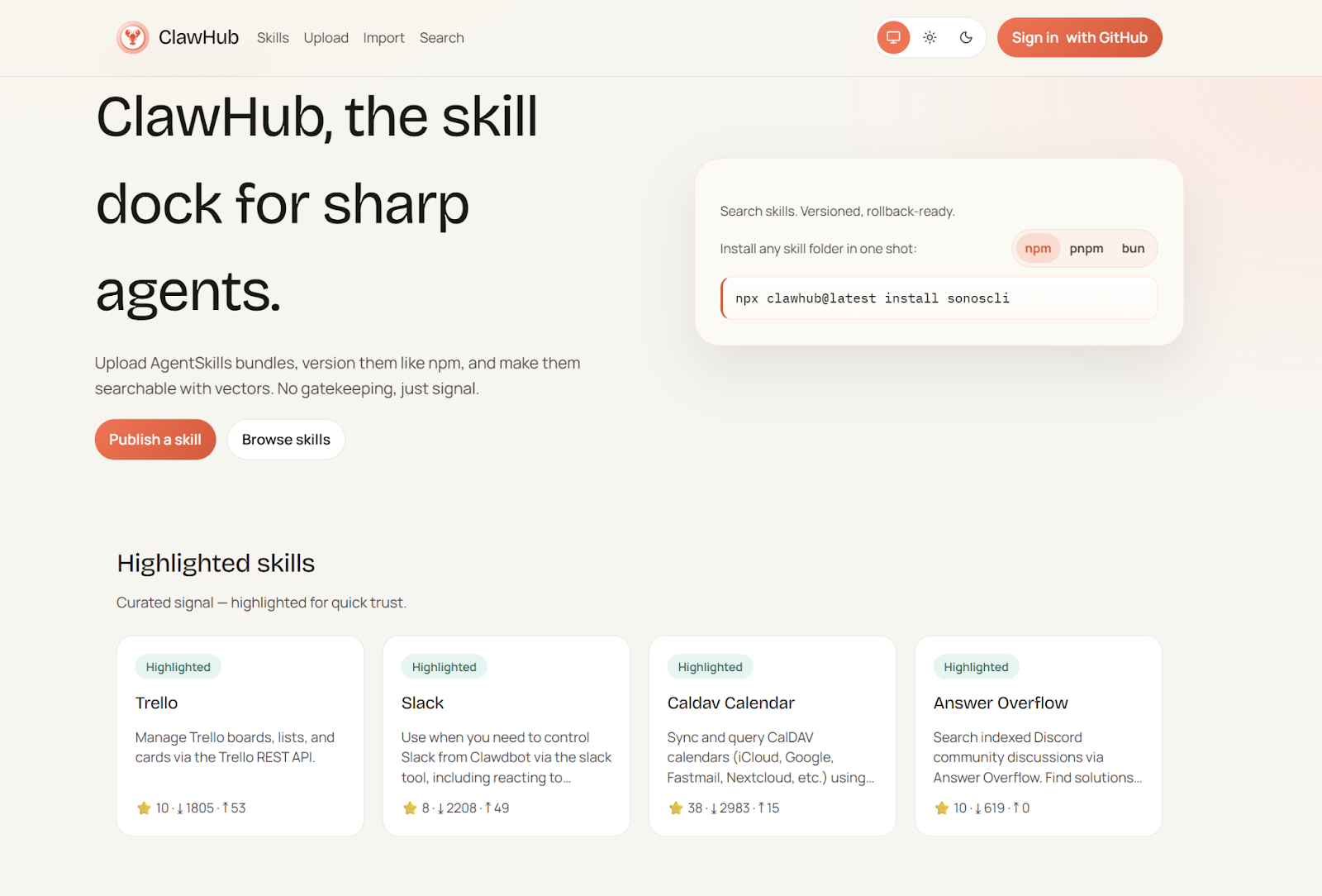 OpenClaw 技能(Skills)拓展集成平台 ClawHub 展示图: