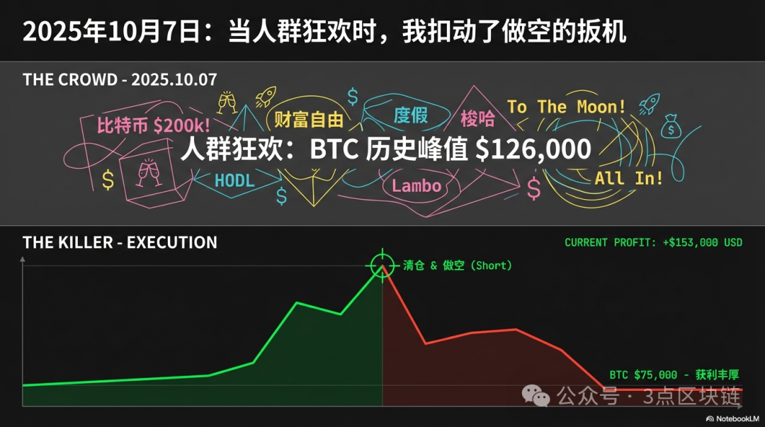 2025年10月7日,比特币创下12.6万美元的历史峰值,整个币圈陷入前所未有的狂欢。社群里满是晒盈利、喊着“比特币突破20万美元”“财富自由就在眼前”的声音,无数交易者忙着加仓、借贷入场,更有甚者,一边刷着“币圈峰会邀请函”,一边规划着盈利后去哪里度假、打卡。而我,在所有人都被狂热情绪裹挟、沉迷于短期狂欢与无用社交时,果断清仓了所有加密资产,毅然反手做空。