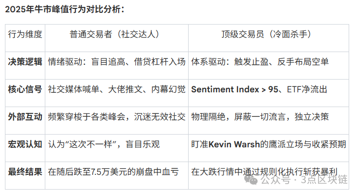我曾见过一位深耕币圈10年的顶级交易员,他管理着上亿美元的加密资产,经历过2018年、2022年两次惨烈熊市,也见证过2021年、2025年两次牛市狂欢。在2025年10月比特币峰值过后的大跌中,他所管理的资产不仅没有亏损,反而实现了30%以上的盈利。有人问他,面对全网爆仓、哀嚎遍野的行情,你就不慌吗?他只是平静地说:“慌没有任何用处,情绪解决不了任何问题,反而会让你做出愚蠢的决策。我的交易体系已经明确了做空信号,我只需要严格执行,剩下的,交给市场就好。”