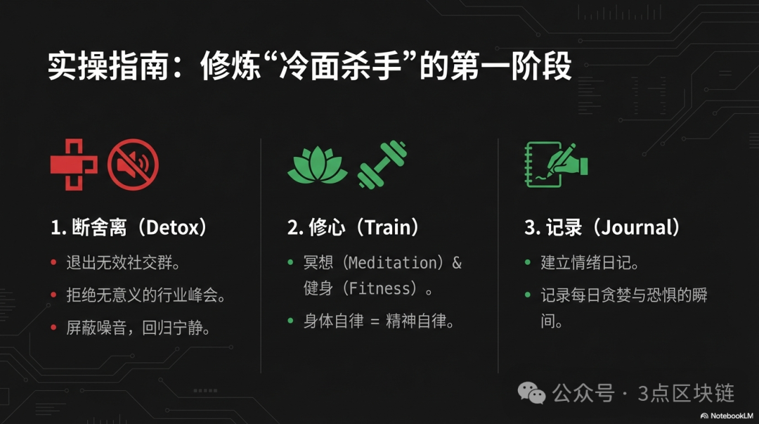 远离喧嚣的社群和八卦。卸载那些充斥着八卦、谣言、无用闲聊的社群,屏蔽那些只会传播情绪、不会提供有用信息的KOL和媒体,避免被外界干扰,避免被情绪裹挟。可以加入1-2个高质量的交易社群,只讨论交易逻辑、复盘经验、体系优化,不讨论八卦、不闲聊、不传播情绪。