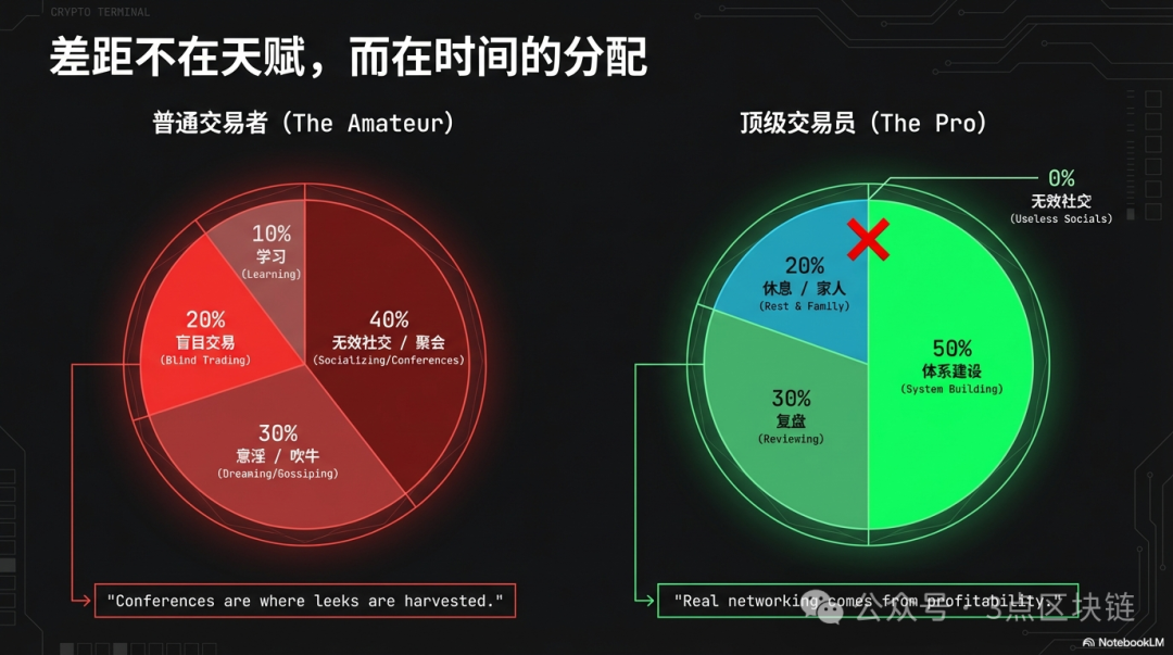 顶级交易员的时间分配,极其规律、极其专注——他们把80%的时间和精力,都花在完善交易体系、复盘交易、修炼心性上;剩下的20%的时间,用于休息、陪伴家人,偶尔关注一下行业核心动态,但从不沉迷于玩乐、从不频繁参加各类峰会、从不进行无用社交。他们深知,时间是最宝贵的资源,把时间花在什么地方,就会在什么地方得到回报;把时间花在打磨交易体系上,才能收获盈利;把时间花在玩乐和参会上,只会收获亏损。
