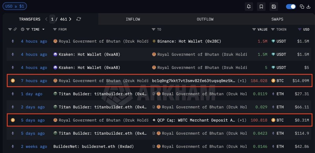 然而,进入 2026 年,当比特币价格从前一年的高点回落至 70,000 美元附近,不丹的持有策略开始出现微妙变化。据Arkham追踪数据,过去半年内,不丹持续向外转移比特币资产,光是过去一周,不丹政府就交易了包括 184 枚比特币(约 1,400 万美元)和 100.8 枚比特币(约 830 万美元),合计约 2,240 万美元。这并非一次性抛售,而是节奏稳定、规模可控的定期减持,单次操作金额通常在 5,000 万美元左右。
