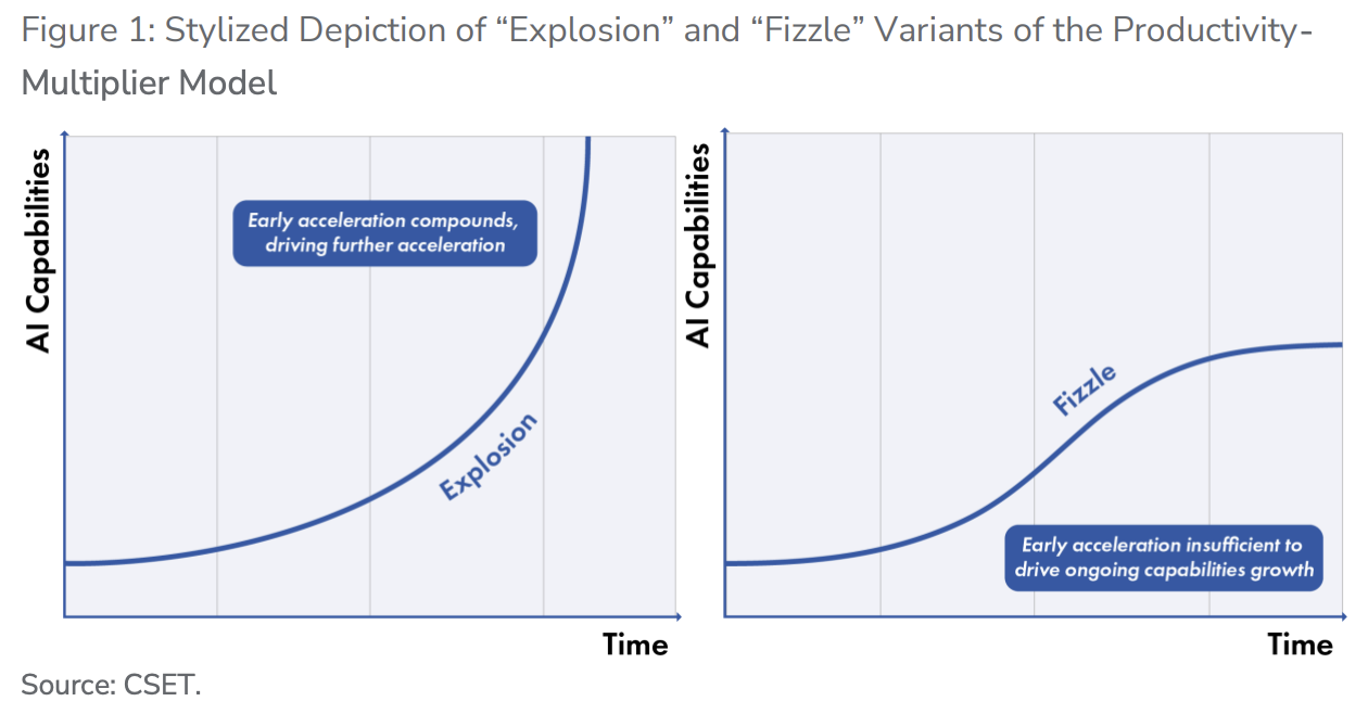 2. Productivity Multiplier Model (Decreased Version)They argue that although AI research and development is becoming increasingly automated, the scientific output generated at a given level of input (such as computing power) is insufficient to drive further compound improvements in capabilities.Although AI research and development is becoming increasingly automated, its capabilities reach a plateau relatively early on.