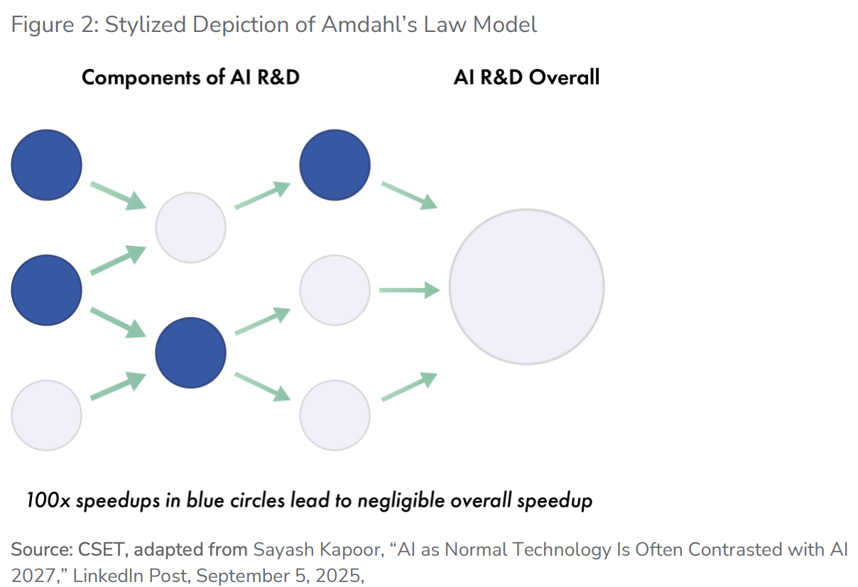 3. Amdahl's Law ModelIt is argued that AI can only automate AI R&D activities in certain specific areas (e.g., writing code and running experiments are automated, but proposing entirely new research projects or operating data centers cannot). Even if automation accelerates certain parts of the R&D process,Overall progress remains constrained by R&D activities that AI cannot automate, thus preventing full automation.