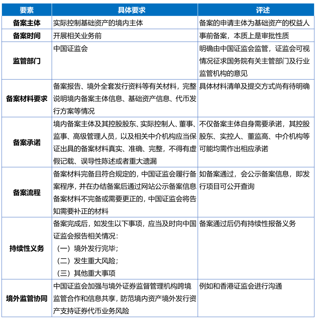2. 《资产支持证券代币监管指引》在上述监管规定的基础上,进一步明确了针对“境内资产境外发行资产支持证券代币”的相关合规要求,以及由中国证监会负责对于“境内资产境外发行资产支持证券代币”进行监管并开展备案,具体而言: