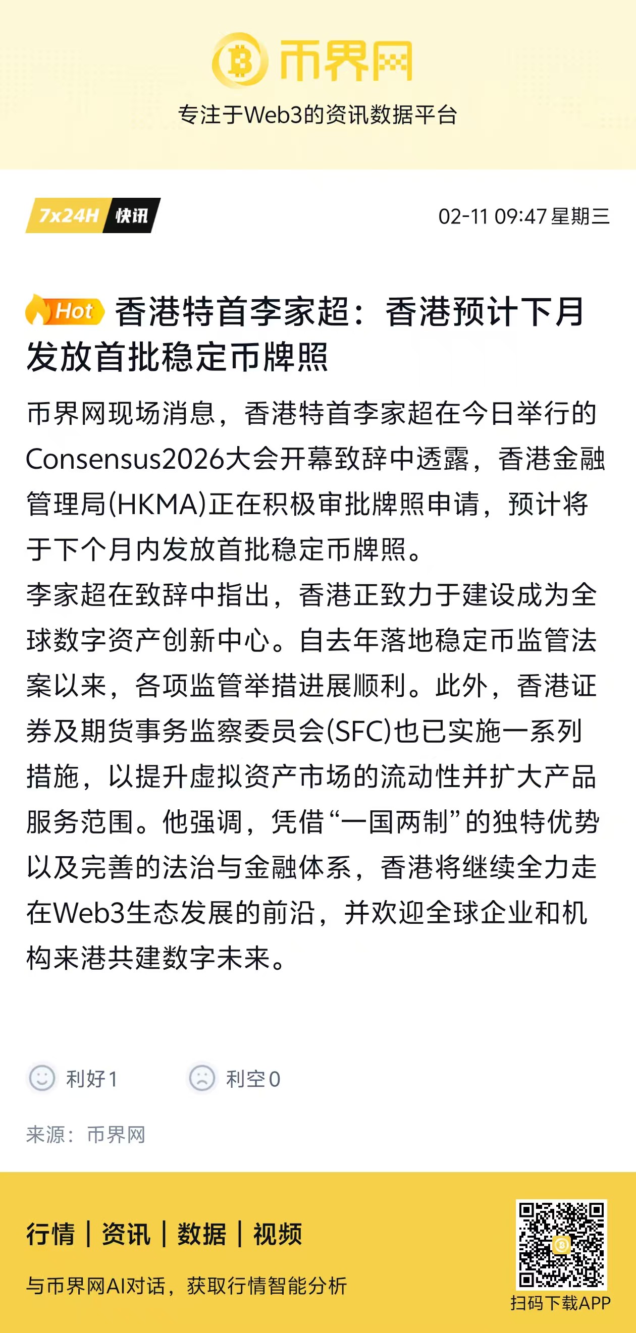 近日,全球最具影响力的加密货币盛会之一——Consensus(共识大会)再次于香港开幕。香港特别行政区行政长官李家超出席2月11日开幕式并发表主旨演讲。李家超在发言中重申了香港建立全球数字资产创新中心的决心,并明确披露了稳定币立法进度及虚拟资产市场监管路线图。他指出,香港正利用其独特的制度优势,通过完善的法律框架和风险管理,推动 Web3 技术深度服务于金融市场与实体经济。