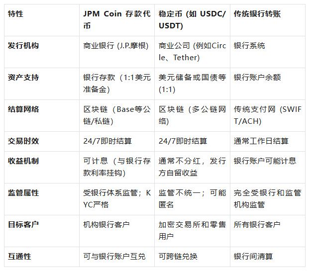 下面表格对比了JPM Coin存款代币、主流稳定币和传统银行转账在发行机构、结算时间、收益机制等方面的主要不同: