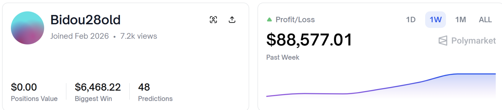 Polymarket 昵称为 Bidou28old 的玩家(0x4460bf2c0aa59db412a6493c2c08970797b62970),今年 2 月刚入驻,仅仅不到 1 天时间,净赚 8 万美元。