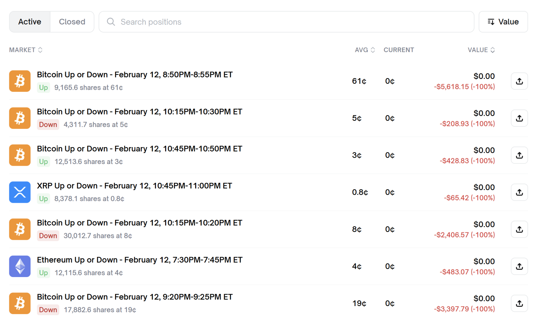如果你从该交易员 Polymarket 地址主页下滑,你一定会被其「亏损」惊得目瞪口呆,仅仅这 7 次亏损,数额就超过 1 万美元。