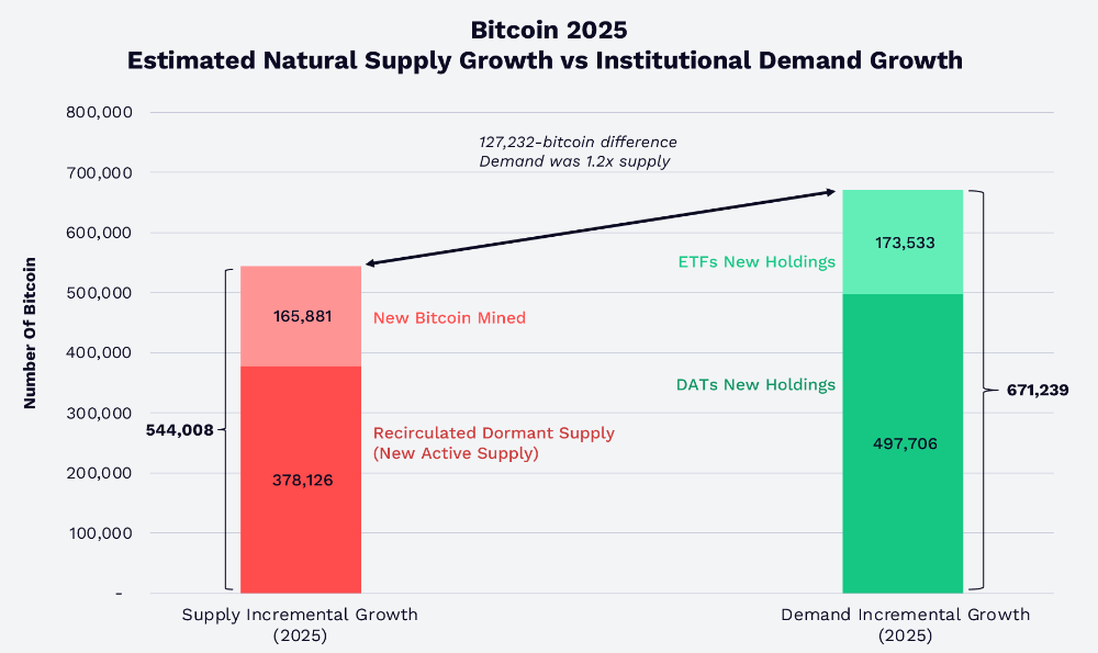 2025年,美国现货比特币ETF和数字资产国库(DAT)吸收的比特币数量相当于新挖矿供应量与重新活跃的休眠比特币总和的1.2倍。到2025年底,ETF和DAT持有比特币总量超过12%。