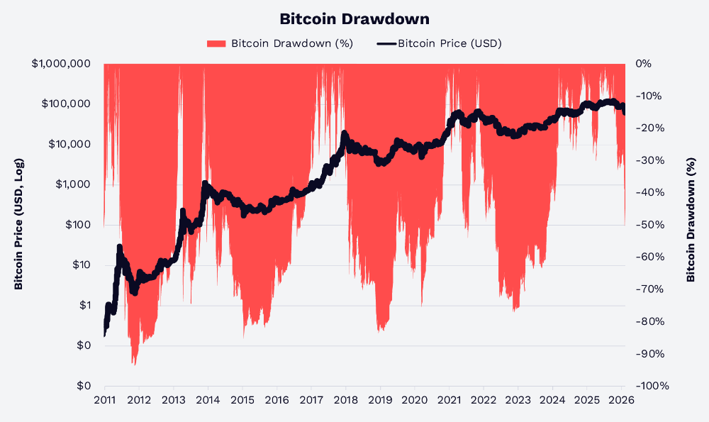 在自 2022 年以来的当前周期,截至 2026 年 2 月 8 日,从历史最高点的下跌幅度未超过约 50%,显示出市场参与逐步加深、流动性改善——即便经历重大修正,如 2026 年 2 月第一周的下跌。