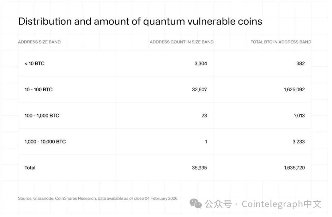 CoinShares的比特币研究员Christopher Bendiksen表示,只有1万230个比特币位于公钥已公开暴露的地址中,这些地址易受足够强大的量子攻击。