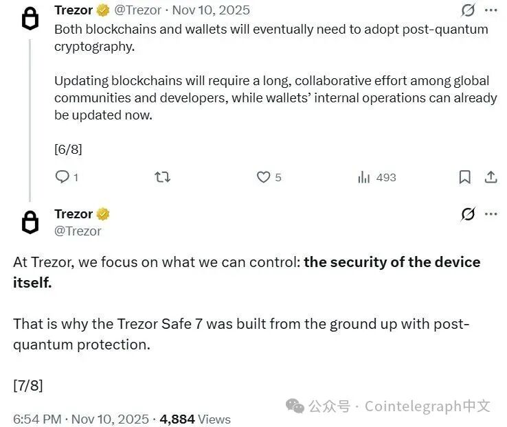 Trezor也承认,区块链本身需要改变其密码学和协议。但该公司的首席技术官Tomáš Sušánka告诉Cointelegraph,钱包可以立即实施保护,而不是等待旷日持久的区块链升级。