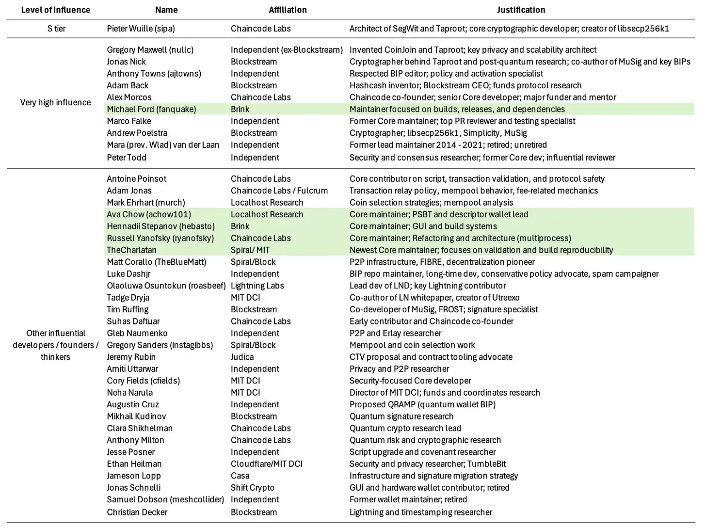 我清楚,按「影响力」给比特币开发者排序,一定会让很多人感到不快,但为了这次分析,这一步是无法回避的。我们必须知道谁才是真正的把关人,才能评估:最重要的比特币开发者是否真的在优先考虑量子风险。你当然可以质疑我的排序,或提出另一套标准,但唯一重要的是——我是否准确找出了那些核心门槛人物。