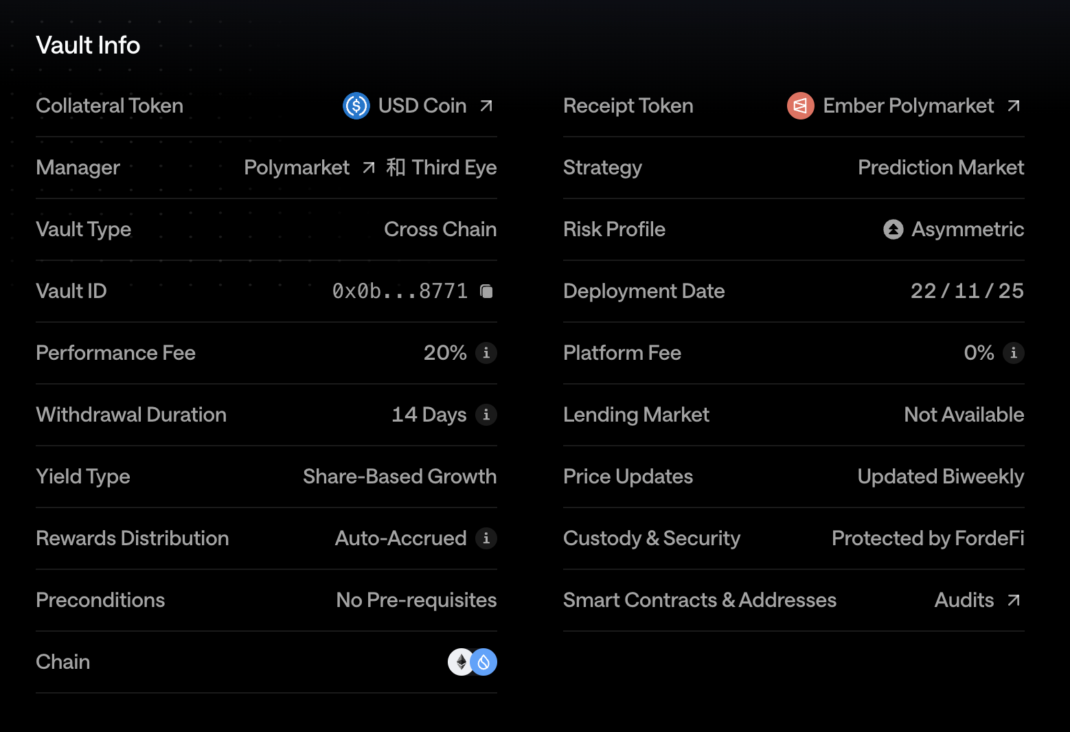 在利润分享、风险结构等方面(风险结构是重点,下文会细说),Polymarket Vault 的运行逻辑与 DeFi 中常见的资金池并无二致,核心区别则在于,管理方 Third Eye “搞钱”的主阵地从相对成熟的 DeFi 市场变成了更早期的预测市场。