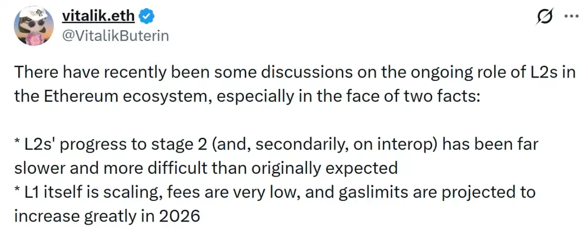 可以说,Vitalik 的态度堪称「尖锐」,直言随着以太坊主网(L1)自身扩容能力的提升,那个在五年前制定的、将 L2 视为主要扩容手段的路线图,已经失效了。