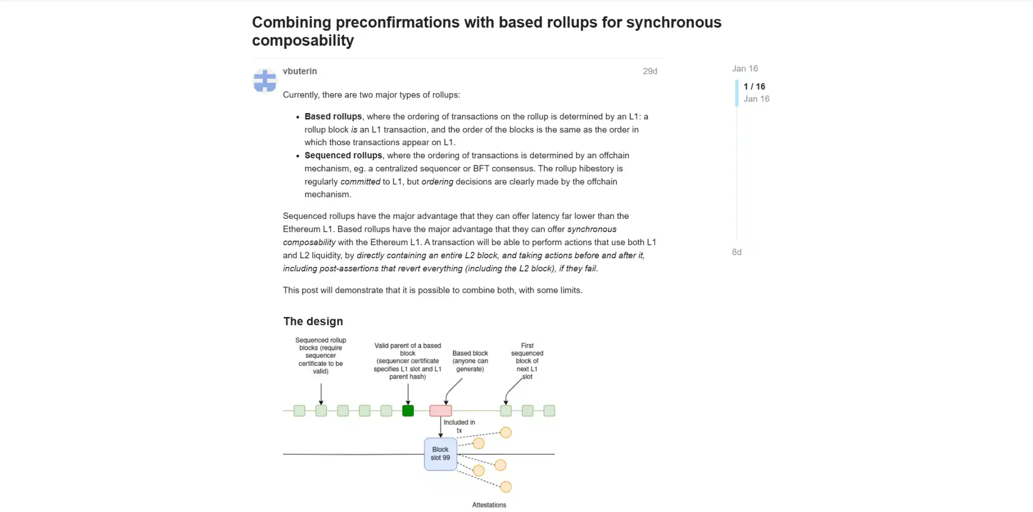 有意思的是,就在 Vitalik 反思 L2 的那条推上,推荐了一个 1 月份的社区提案《Combining preconfirmations with based rollups for synchronous composability》,这篇提案的核心,并不是单纯地推 Based Rollup,而是提出一种混合结构: