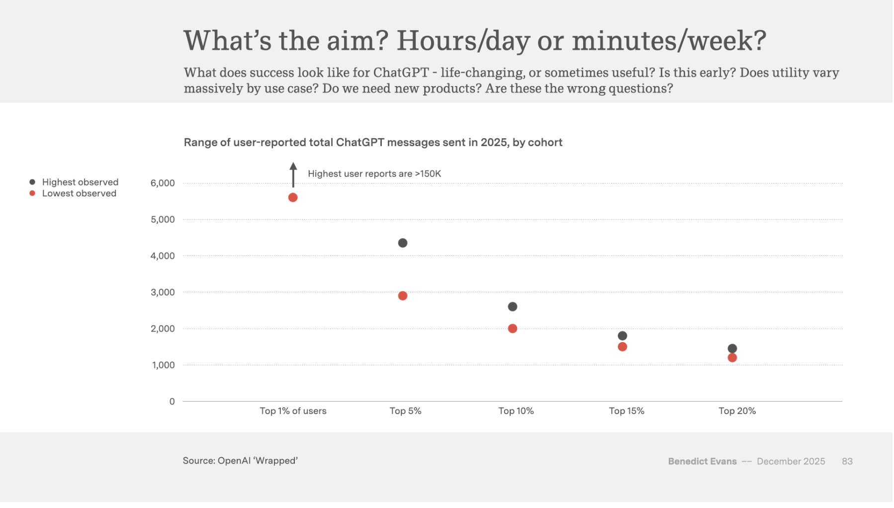Evans指出,OpenAI当前的商业模式并不具备明确的竞争优势。该公司既没有独特技术,也没有形成网络效应,其9亿周活跃用户中仅5%付费,且80%用户在2025年发送的消息少于1000条——相当于每天平均不到三次提示。这种“一英里宽、一英寸深”的使用模式表明,ChatGPT尚未成为用户的日常习惯。