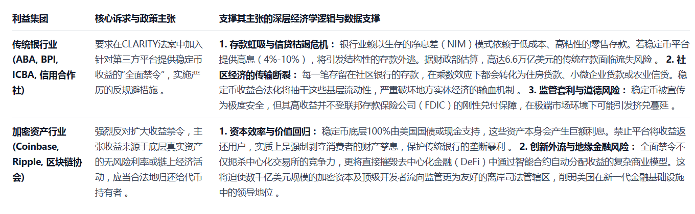 下表详细对比了传统银行业与加密行业在生息稳定币议题上的核心论点与深层逻辑:
