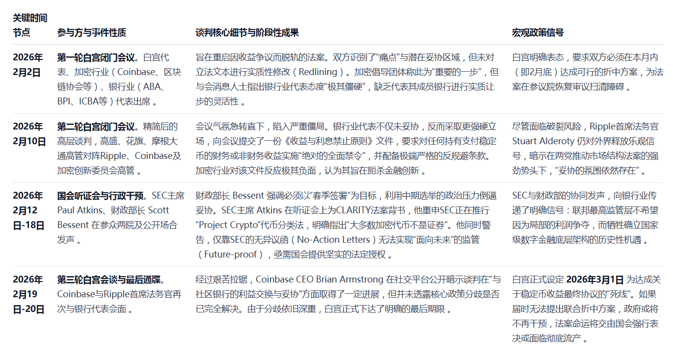 另一方面,参议院银行、住房和城市事务委员会则在起草一部更为宏大、包含银行业务创新与消费者保护的综合性修订草案。正是在这一委员会的闭门磋商中,传统银行业的游说力量开始全面发力,将阻击“生息稳定币”确立为其不可退让的核心战略目标 。这为2026年初爆发的立法危机埋下了伏笔。