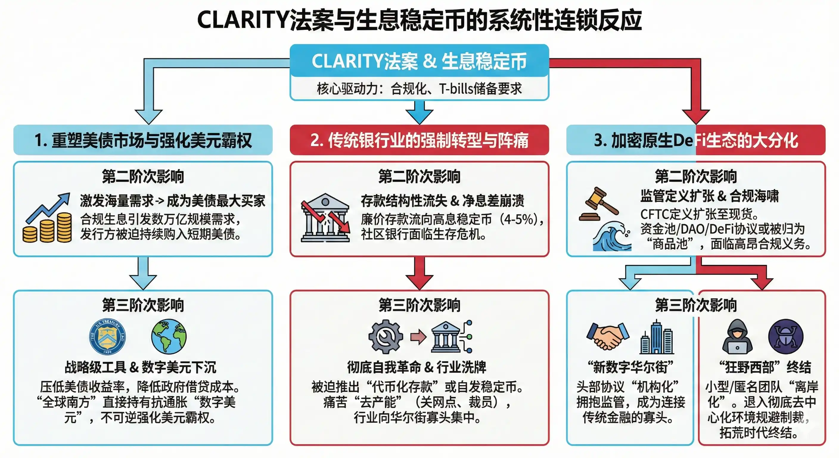 CLARITY法案的成败,以及生息稳定币收益权的最终归属,绝非单纯的行业利润再分配。这一立法的溢出效应将穿透加密圈层,对美国的宏观债务融资、美元的全球霸权以及传统金融体系的演进产生深远的系统性连锁反应。