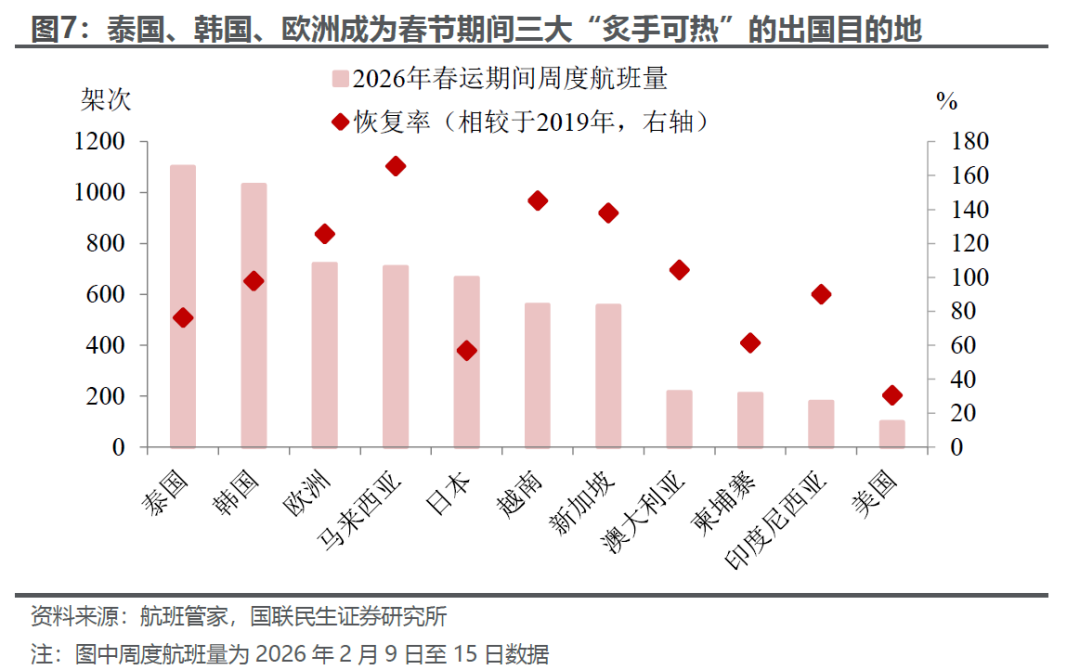 假期拉长也催生出多元消费场景。超长假期不仅拉长了出行窗口,更催生出多元化的消费场景。出境游热度也明显攀升,春节期间港澳台及国际航班执飞班次显著高于2025年同期,泰国、韩国、欧洲成为三大“炙手可热”的目的地。